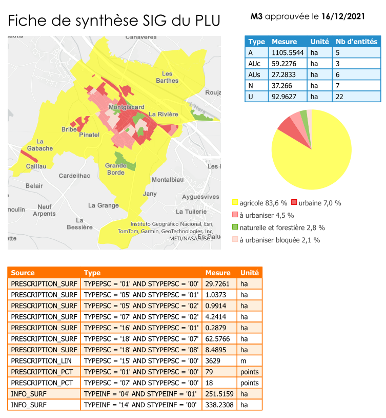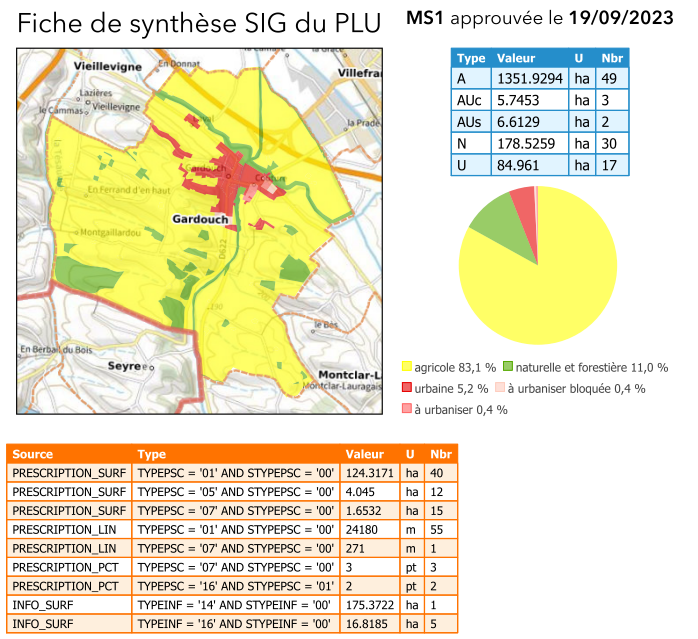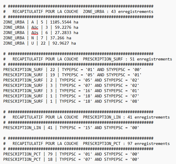 Vous y trouverez un détail du zonage ainsi que les données par type/ sous-type des prescriptions et informations sous forme de fichier log mais aussi dans une fiche de synthèse SIG du PLU(i) analysé.